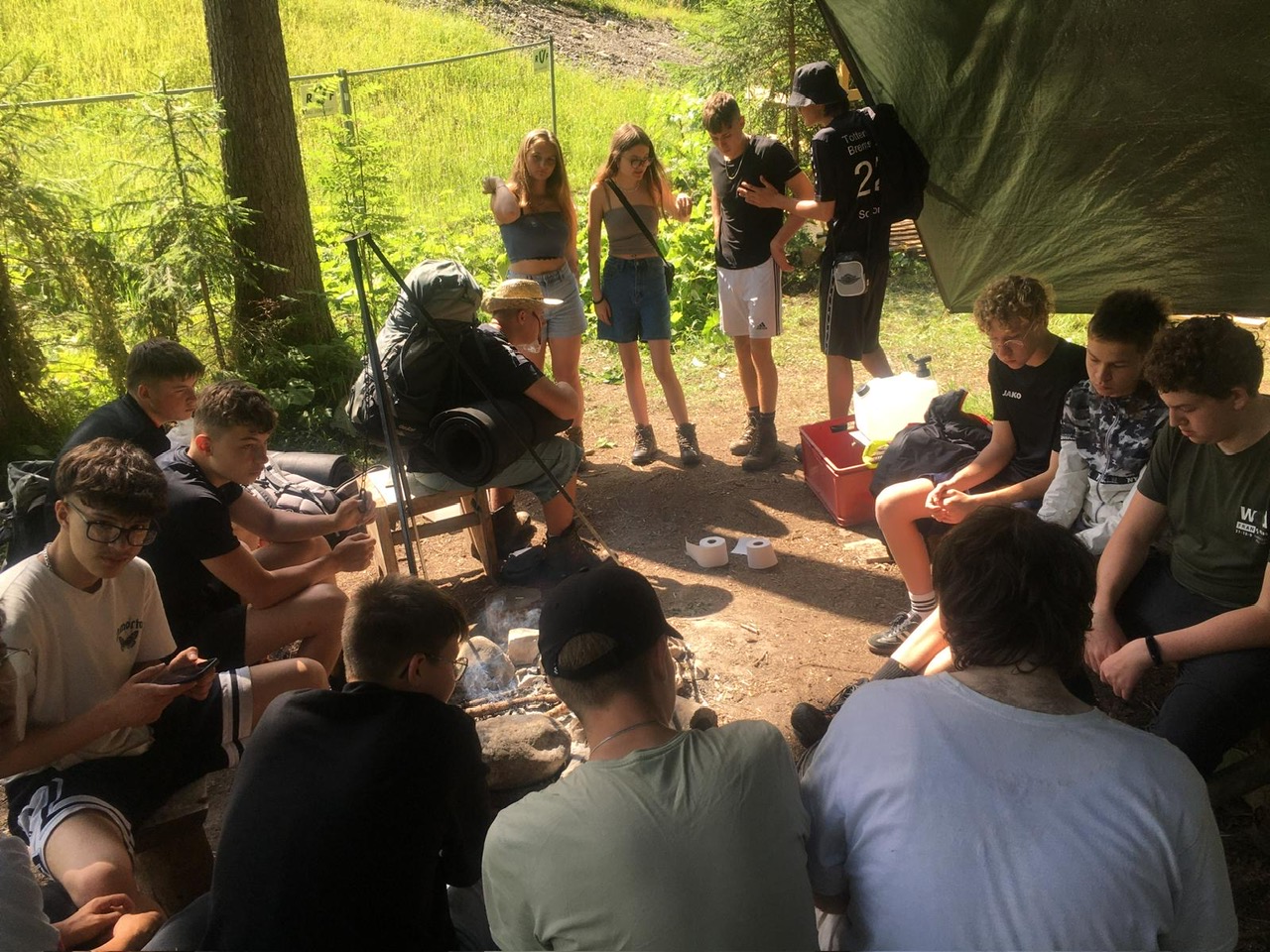 Am zweiten Tag begann unser großes Abenteuer: eine selbst geplante und selbst versorgte zweitägige Tour. Nach der Planungsphase und einer letzten Besprechung machten wir uns gegen 14 Uhr mit unseren Rucksäcken auf den Weg. Die Route führte uns durch malerische Landschaften, über Hügel und entlang von Flüssen. Am Nachmittag erreichten wir unseren geplanten Biwakplatz im Wald, direkt an einem Fluss. Gemeinsam bauten wir unsere Zelte auf und bereiteten das Abendessen zu. Es war eine besondere Erfahrung, komplett auf uns gestellt zu sein und als Team zusammenzuarbeiten. Die Nacht im Wald, umgeben von der Natur, war für viele von uns ein unvergessliches Erlebnis.