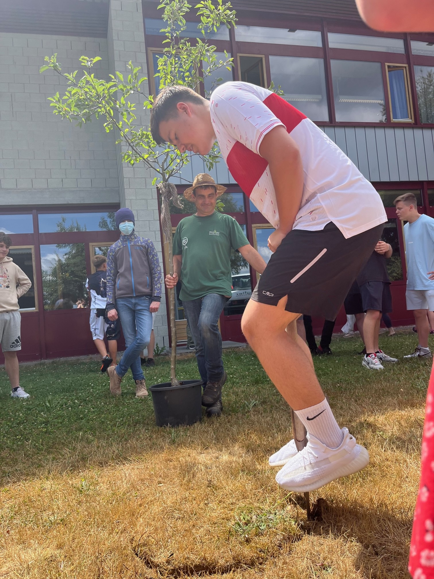 Im Rahmen der Abschlussfeier der Realschulabschlussklasse hat die Klasse 10 gemeinsam mit der Baumschule Müller am 12.07.2023 ihren eigenen Obstbaum im Schulgarten gepflanzt.