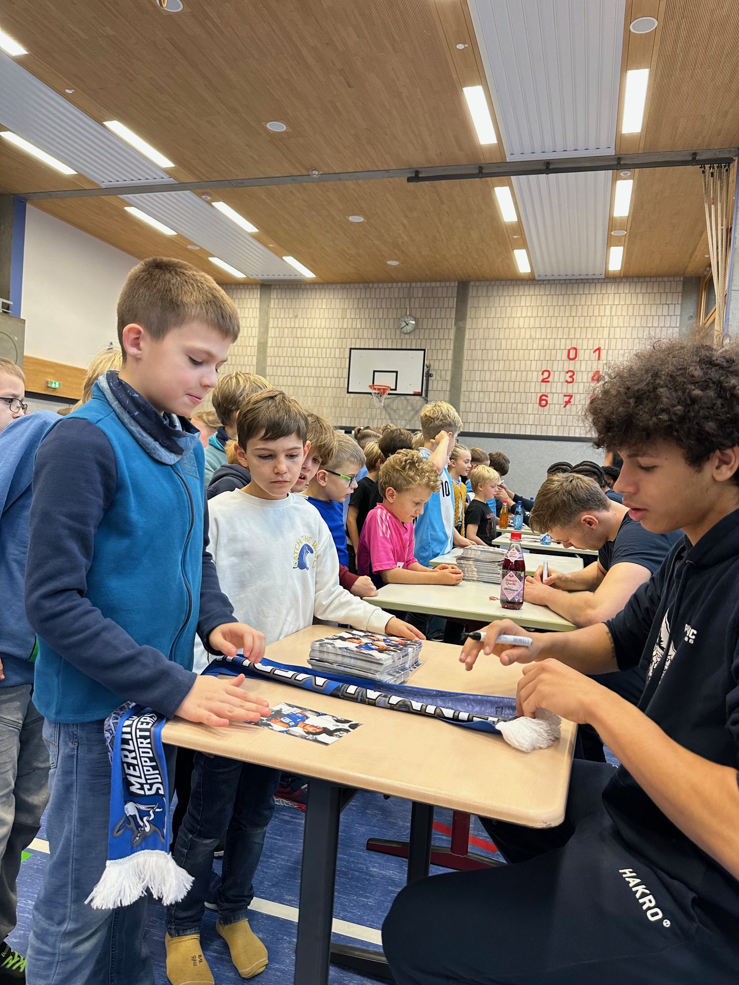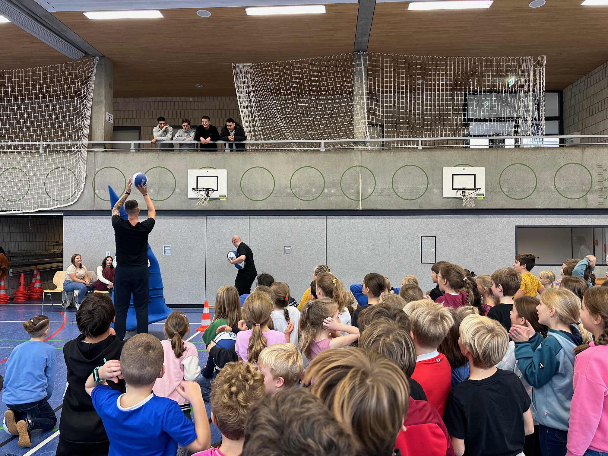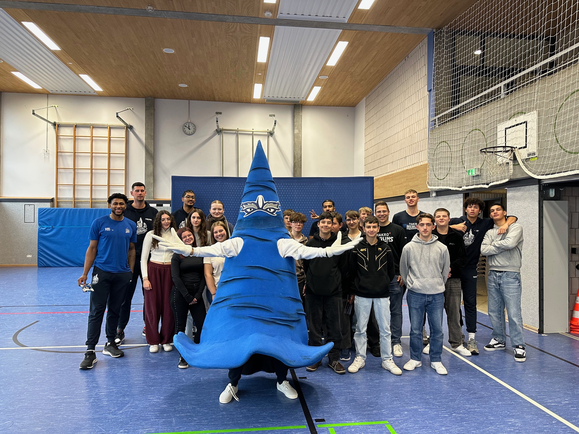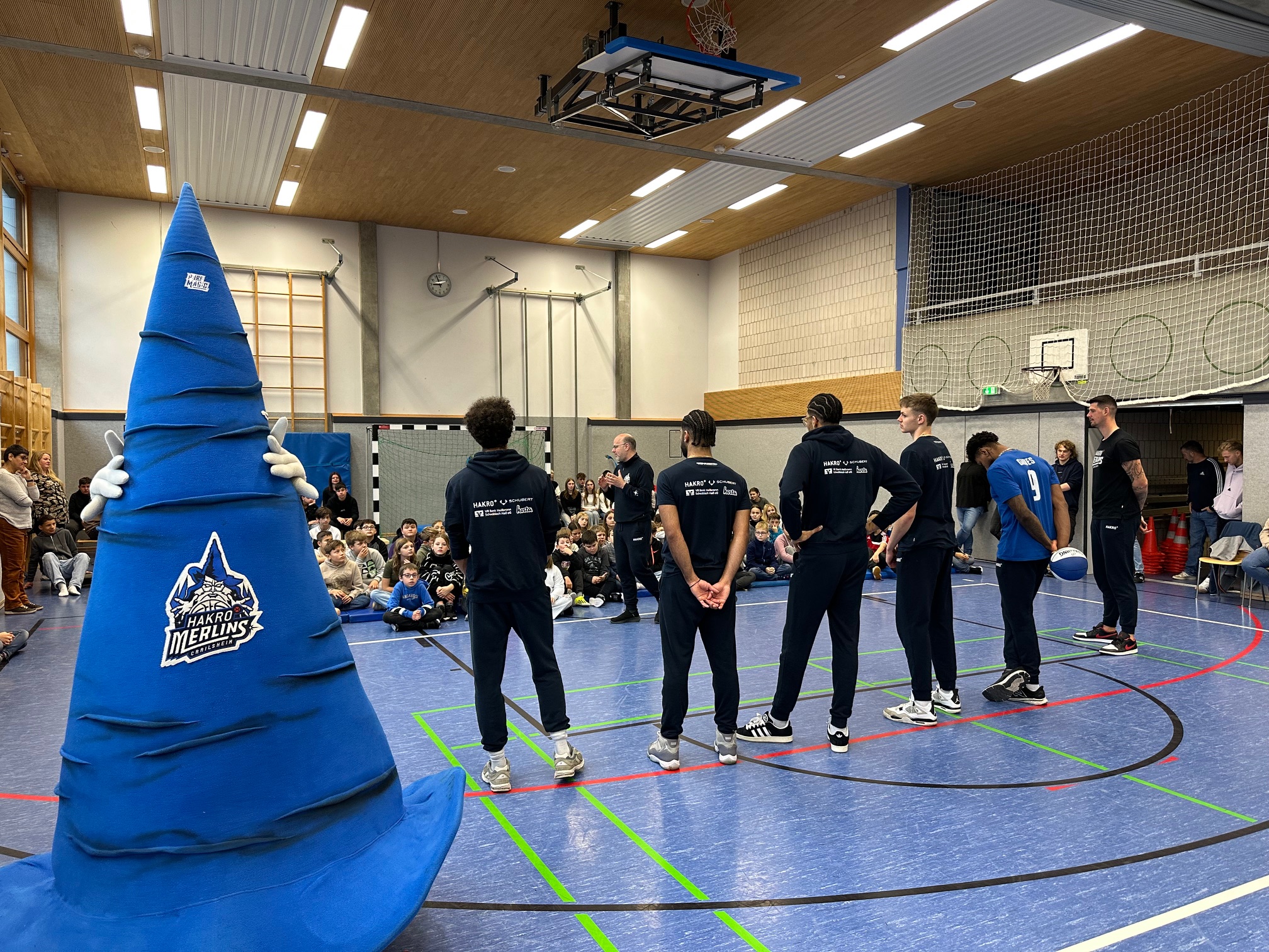 Bereits knapp drei Wochen vorher nahmen sich die Hakro Merlins aus Crailsheim vier Stunden lang Zeit, um den Grundschülern, Klasse 5-7 und Klassen 8-10 in Gruppen per Showtraining den Bundesligabasketball näher zu bringen. Eine knapp 60-minütige Autogrammstunde rundete den sportlichen Vormittag ab und hinterließ viele glückliche Gesichter.