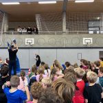 Ingo Enskat, sportlicher Leiter der Hakro Merlins, führte durch das abwechslungsreiche Programm. Fünf Spieler des Lizenzkaders zeigten eindrucksvoll, worum es im Basketball geht und standen nach diversen Wettbewerben im Körbewerfen Rede und Antwort für Fragen der Schülerinnen und Schüler. Einen ausführlichen Zeitungsbericht finden Sie unterhalb der Bildergalerie.